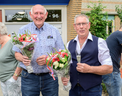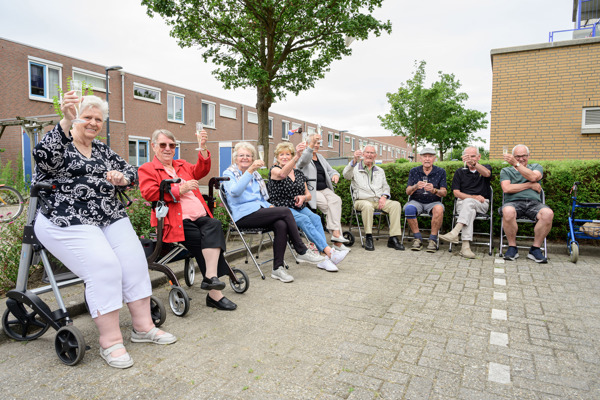 Op 6 juli was de feestelijke opening van het portiek aan het Koolwitjehof 52-96, de flat waarin Fred en Siem wonen. Hun portiek was als eerste klaar. Ook de bewoners uit de andere twee flats waren erbij. De zon scheen, het was gezellig druk en de reacties waren louter positief. Siem en Fred zijn tot het laatste moment actief geweest: ‘Het bankje hebben we de avond ervoor als verrassing voor de bewoners in elkaar gezet. Ook hebben we toen de foto’s opgehangen die we hadden uitgezocht en de plant neergezet’, vertelt Fred. ‘Onze vrouwen hebben de ballonnen opgehangen en aan het eind hebben we samen de boel nog schoongemaakt.’