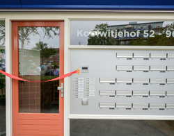 De grote open ruimte onder de luifels is omgetoverd tot een gesloten hal. In de nieuwe puien zijn de brievenbussen en het bellentableau verwerkt. De verlichting brandt altijd zachtjes en wordt fel zodra iemand binnenkomt. Verder hebben alle bewoners ook een videofoon gekregen. Zo kunnen ze via een camera voortaan zien wie er voor de deur staat. ‘Die is echt perfect’, vindt Fred. ‘De kijkhoek is groot en ook als het donker is kun je alles goed zien.’ Tot slot is ook het sluitsysteem elektrisch geworden. Bewoners kunnen nu naar binnen met een tag. Ook dat bevalt iedereen uitstekend.