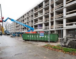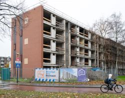 De woningen zijn straks bereikbaar via een gloednieuwe galerij. Daardoor zijn de trappenhuizen overbodig en kunnen we die ruimte toevoegen aan de woningen. We zijn nu gestart met opbouwen. Eerste stap is het wind- en waterdicht maken van de flat. Daarna gaan we binnen afbouwen.