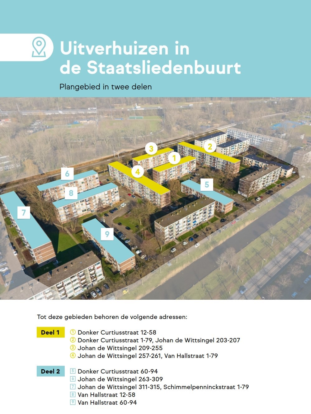 Voor deze herontwikkeling moeten de huidige huurders wel eerst verhuizen. Zij krijgen hiervoor ruim de tijd (circa 1,5 jaar). Vanwege de krappe woningmarkt vindt het uitverhuizen in twee delen plaats. Op deze manier voorkomen we dat te veel mensen tegelijkertijd met urgentie een woning zoeken. In het kaartje ziet u hoe we de buurt verdeeld hebben. Deel 1 is op 1 april 2025 gestart met uitverhuizen. Deel 2 is op 1 januari 2026 gestart.
