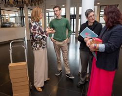 Vanmorgen, donderdag 2 april, ontvingen fractievoorzitters Sun van Dijk (Lijst 1), Elise Allart (Partij voor de Dieren) en Jort van der Voorden (D66) de zware beslisagenda uit handen van onze directeur-bestuurder Marieke Stam. Miranda de Koster en Kees van der Tuijn namen de agenda namens Catelijne de Groot (50Plus) in ontvangst. Hiermee hopen we het thema wonen tijdens de coalitieonderhandelingen en de jaren erna hoog op de agenda te zetten. De zware beslissingen waarom het in Schiedam draait, hebben we samengevat in een beknopte brochure met 9 aandachtspunten. Ook deze hebben we overhandigd.
