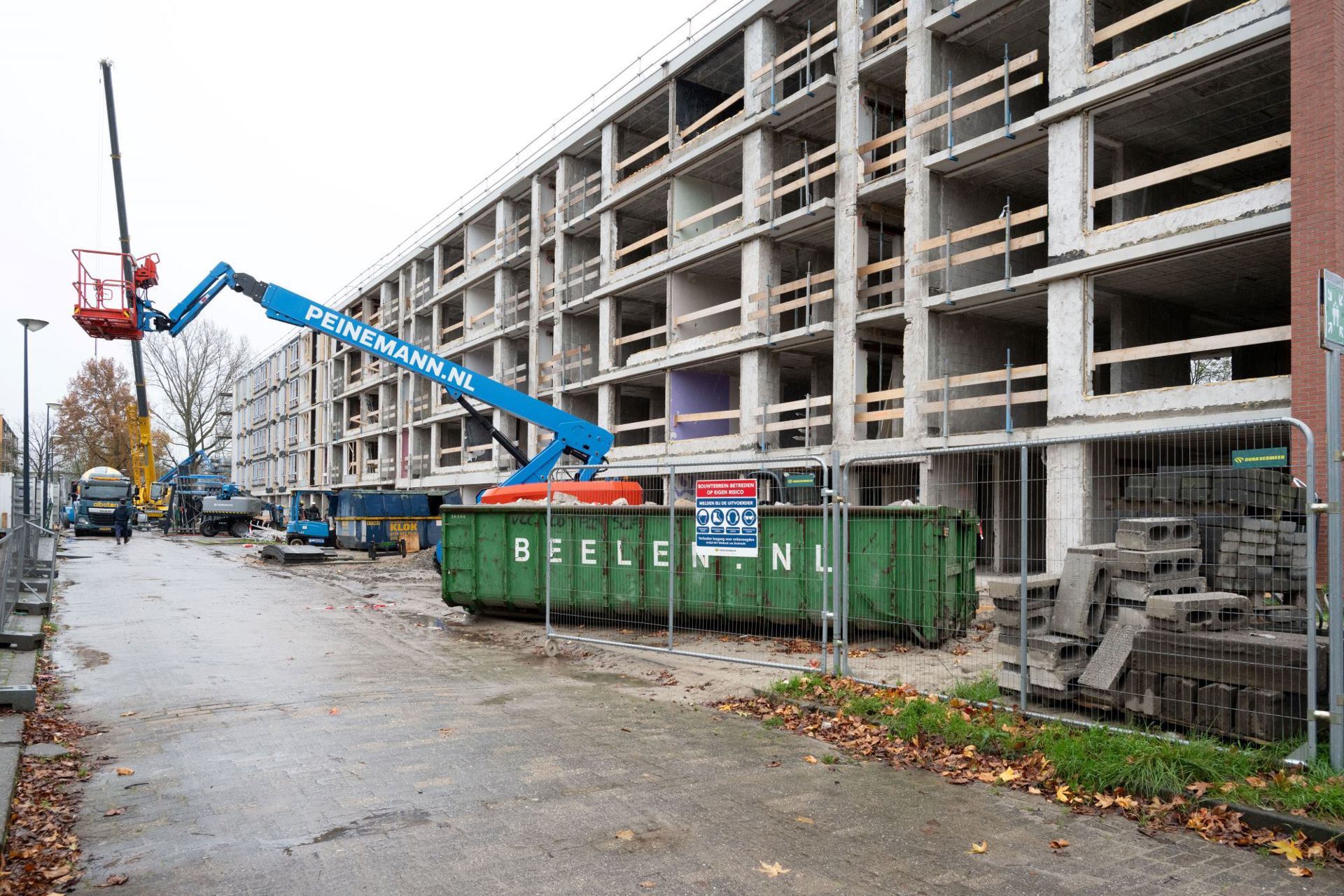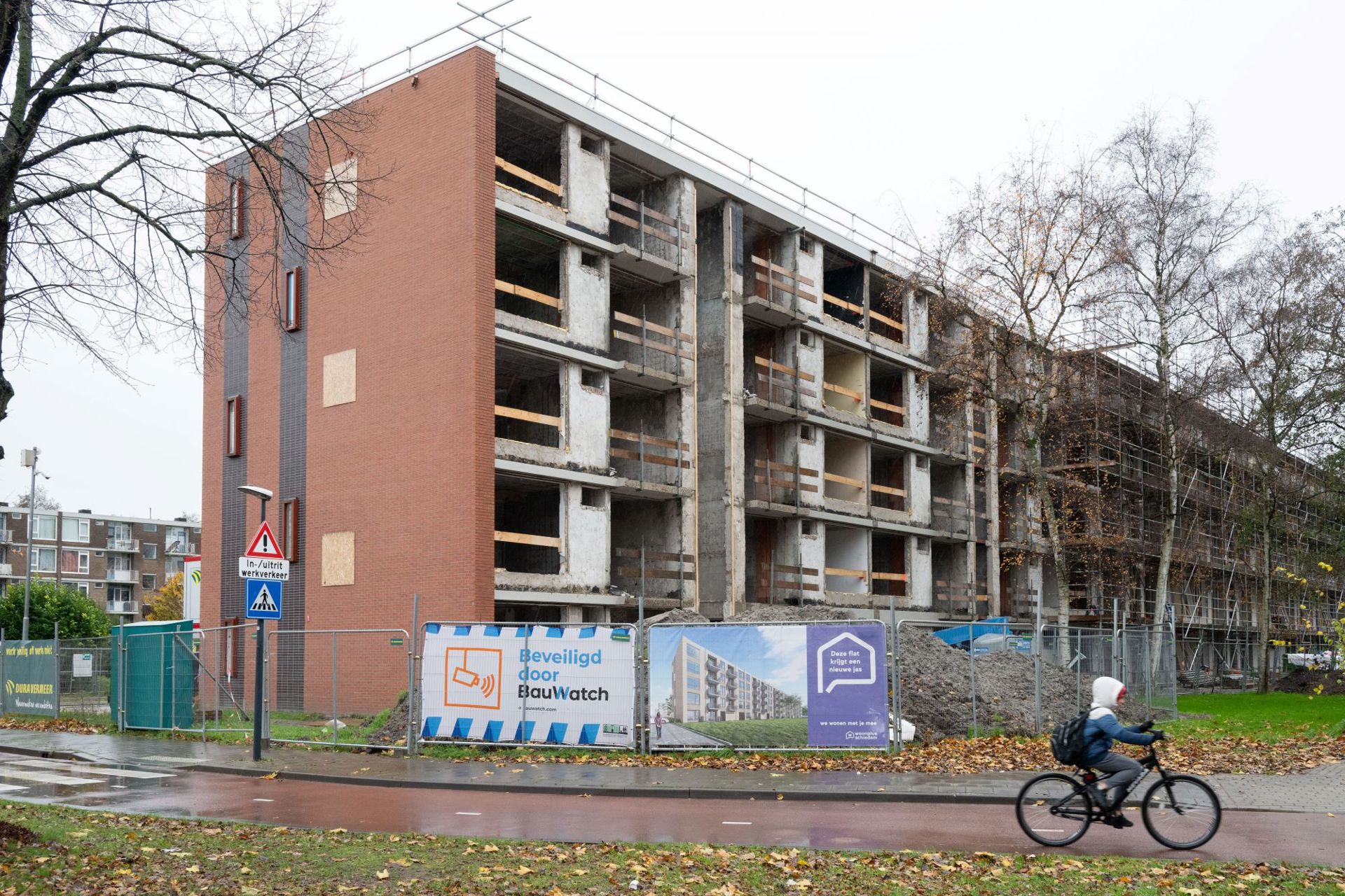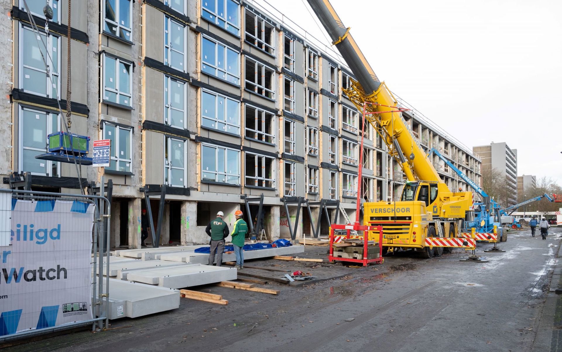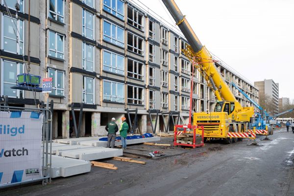 De woningen zijn straks bereikbaar via een gloednieuwe galerij. Daardoor zijn de trappenhuizen overbodig en kunnen we die ruimte toevoegen aan de woningen. We zijn nu gestart met opbouwen. Eerste stap is het wind- en waterdicht maken van de flat. Daarna gaan we binnen afbouwen.