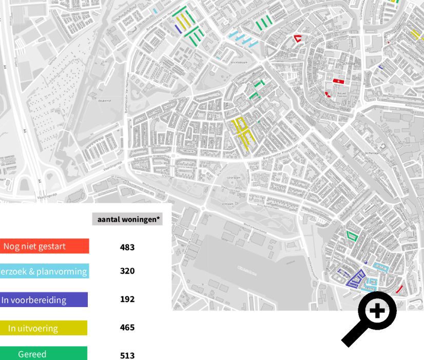 Dit project voeren we uit met vier partners: Smits Vastgoedzorg, Hoftijzer, ERA Contour en BM van Houwelingen. Begin 2024 is de uitvoering van de eerste werkzaamheden gestart. Tot nu toe leverden we 513 woningen op. Bij nog eens 465 woningen is de uitvoering opgestart. Tegelijkertijd loopt de voorbereiding en ontwikkeling van nieuwe deelprojecten.